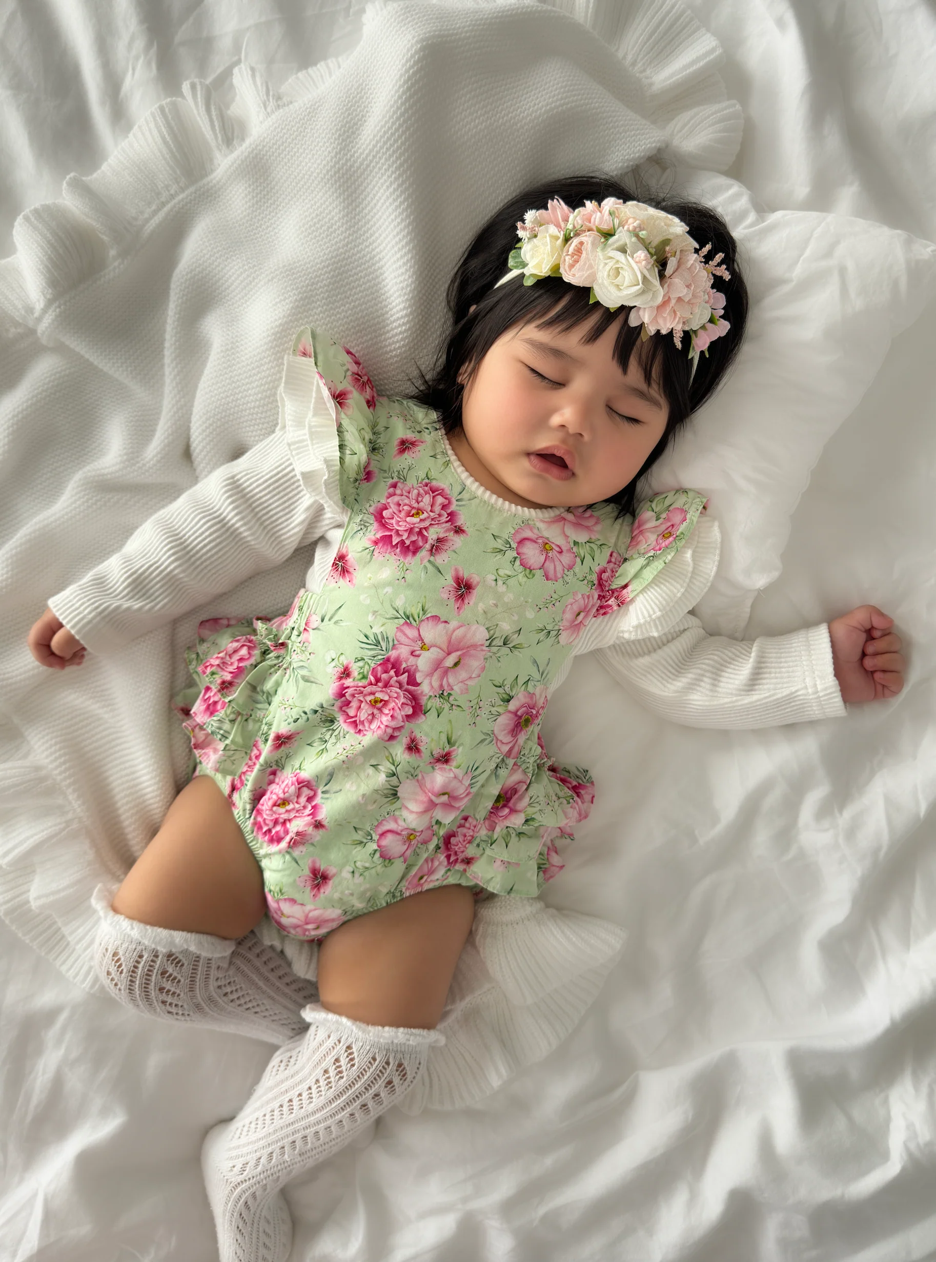 Crafted in a lightweight pink floral print on a green base, this romper features the sweetest ruffled straps that cross over and button at the back, plus ruffled bloomers with an elasticated waist and leg openings, and snaps at the bottom for easy on-and-off wear. Perfect worn alone in warmer months or layered with tights, socks, and a cardigan when it's cooler. Perfect for warm-weather adventures and everyday play.